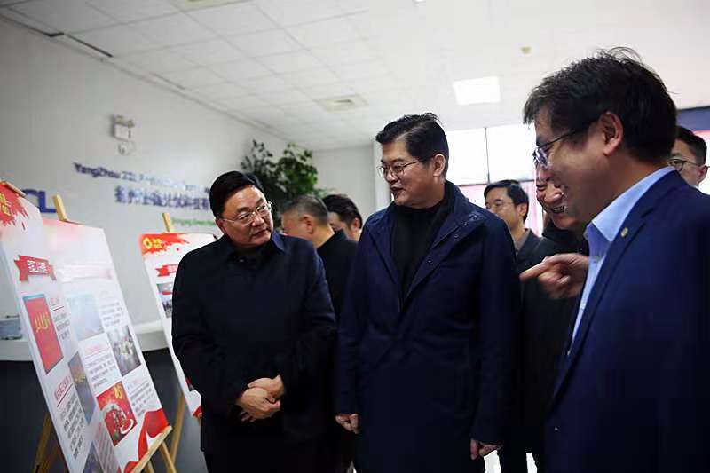 在宣傳展板前,總經理張喜向來訪領導匯報了公司工會民主管理的案例,魏國強主席對協鑫承辦業內首創的切片技能大賽予以肯定,對協鑫以紅色文化為引導,以企業文化聚人心的做法給予高度評價,更是點贊了揚州光伏“全國工人先鋒號”及省運會代表方陣等榮譽。