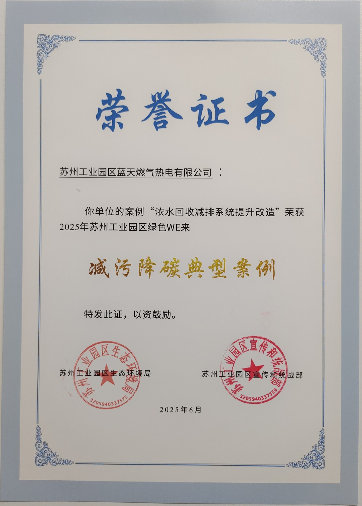 6月4日,蘇州工業(yè)園區(qū)藍(lán)天燃?xì)鉄犭娪邢薰尽皾馑厥諟p排系統(tǒng)改造案例”榮獲蘇州工業(yè)園區(qū)生態(tài)環(huán)境局“減污降碳典型案例”獎(jiǎng)項(xiàng),為企業(yè)綠色發(fā)展提供了可復(fù)制的樣板。