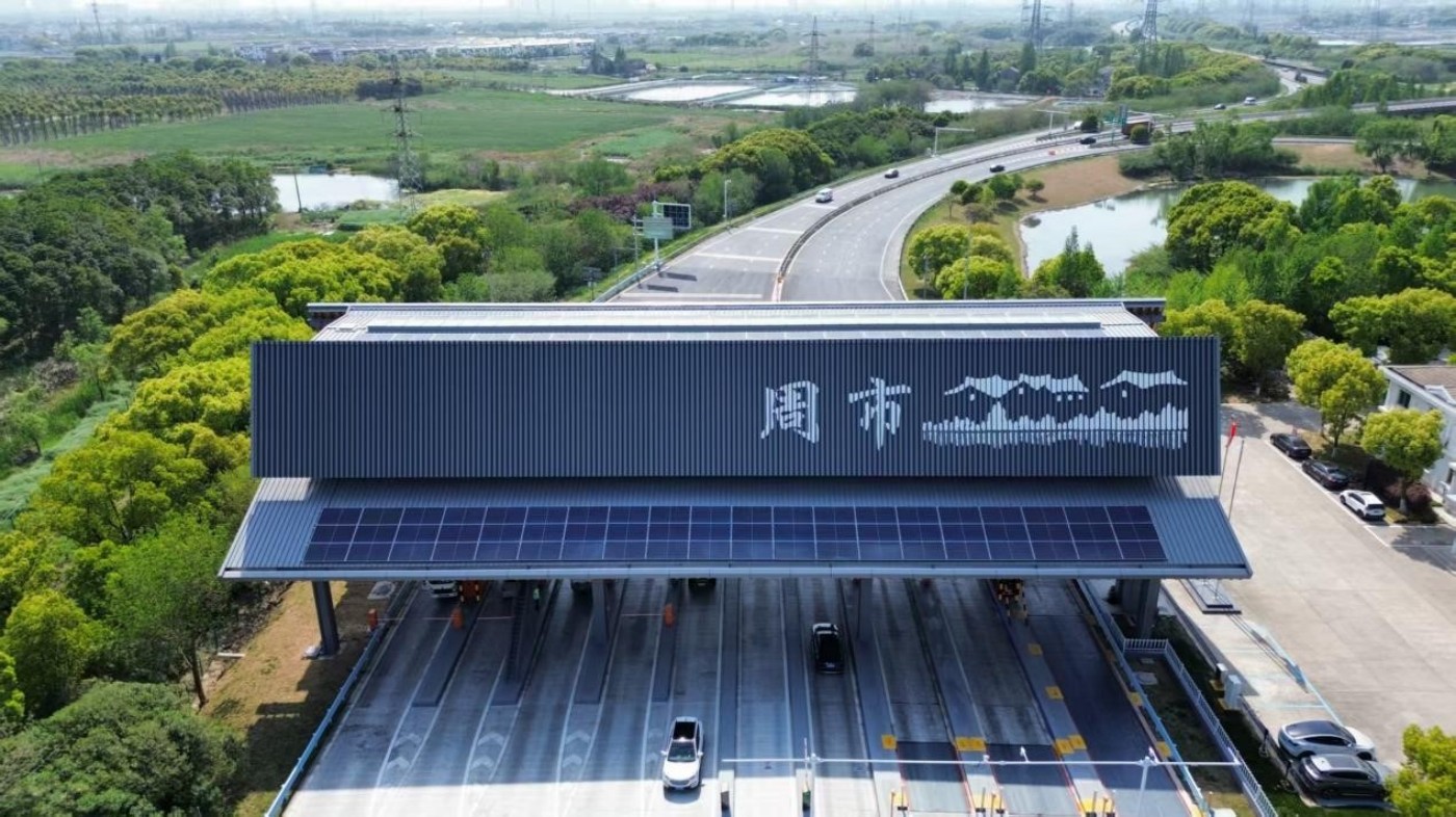 充分利用收費站大棚頂面、下坡屋面1100平方米敷設光伏組件