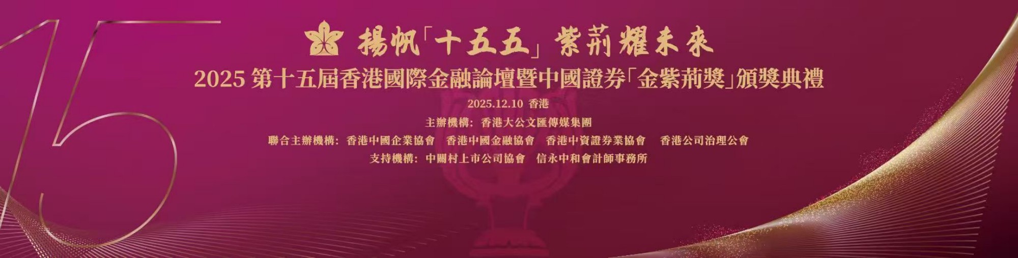 本屆金紫荊獎以“揚帆十五五 紫荊耀未來”為主題,匯聚逾三百位來自內(nèi)地與香港的財經(jīng)官員、金融機構(gòu)負(fù)責(zé)人及上市公司高管。全國政協(xié)委員、香港大公文匯傳媒集團董事長李大宏,香港特區(qū)政府財政司副司長黃偉綸等嘉賓為論壇開幕式致辭。頒獎典禮共頒出“2025年度經(jīng)濟人物”、“2025年度卓越企業(yè)家”、“卓越上市公司CEO”、“卓越上市公司CFO”、“卓越上市公司董事會秘書”、“卓越上市公司”、“卓越高質(zhì)量發(fā)展上市公司”、“卓越投資者關(guān)系管理上市公司”、“最具投資價值上市公司”、“卓越長期價值回報上市公司”共計11大類獎項。