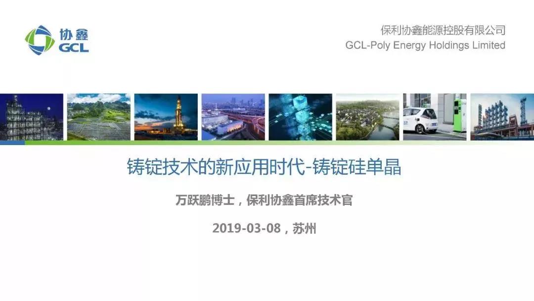3月8日,由江蘇省光伏產業協會主辦,蘇州市光伏產業協會協辦,阿特斯陽光電力集團有限公司、保利協鑫能源控股有限公司承辦的“2019高效多晶及光伏先進技術和產品研討會”在蘇州舉行。保利協鑫首席技術官萬躍鵬博士作《鑄錠技術的新應用時代——鑄錠硅單晶》主旨報告。