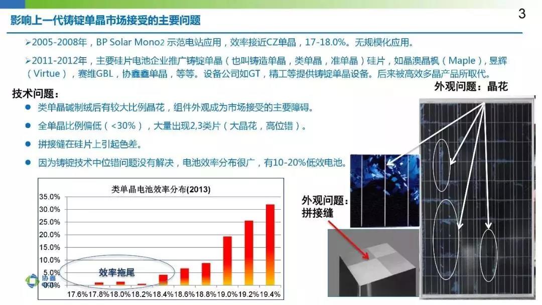 大家要問為什么第一代鑄錠單晶產品沒有在市場上大范圍推廣開來呢?這個問題必須解釋清楚。在我看來,第一個問題在組件的表面上有晶花,導致外觀上有一點點色差,這是主要問題,繼而影響市場接受;第二個就是效率拖尾問題。包括這兩個在內的問題,成為當時影響市場化應用的主要瓶頸。然而,在過去幾年里,協鑫研發團隊著力增加單晶比例,發力降低位錯,效率大幅提升。