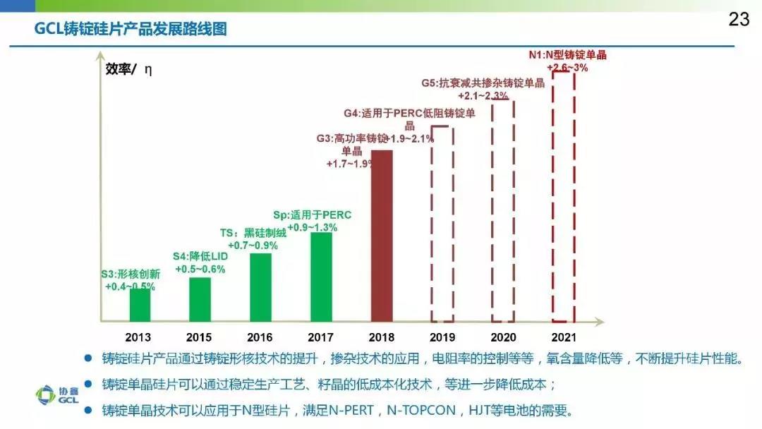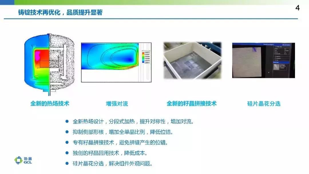 下面我們來看一看協鑫鑄錠單晶的研發歷程。大家或許通過我的報告,可以體會到現在為什么是鑄錠單晶“新”的應用時代。2011年,整個光伏行業都在做或準備做鑄錠單晶,那可謂是鼎盛時期。協鑫、賽維、晶澳、昱輝等企業都推出第一代鑄錠單晶產品,組件產品也有應用,但是由于種種原因沒有大范圍推廣。盡管如此,協鑫依然沒有停止研發的腳步。2013年,協鑫開發出鑄錠單晶第二代,2017年又推出第三代鑄錠單晶,即“鑫單晶G3”。這一代產品很不錯,經過一年多的降本提效,市場逐步接受。到2018年底,幾家主要客戶開始規模化應用。所以我認為,鑄錠單晶“新”的應用時代真正到來了,而且市場份額會提升得非常迅速。