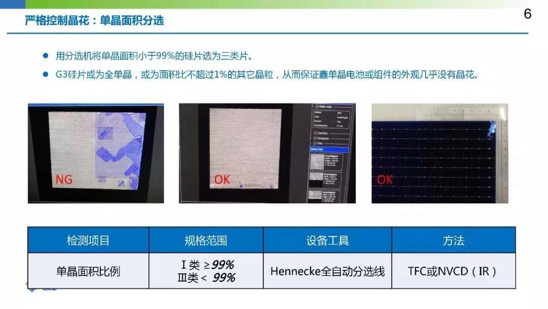 對客戶來說,最關心的是購買的硅片產品到底有著什么樣的市場和性價比優勢。一個很重要的信息,“鑫單晶G3”這款產品,要么是100%單晶,要么最多不會超過1%的其他晶粒。大家看看右下側這幅“鑫單晶G3”產品圖。 這是一張放大的照片,其不到1%硅片面積的小晶粒色差,屬于鑫單晶可以接受的。