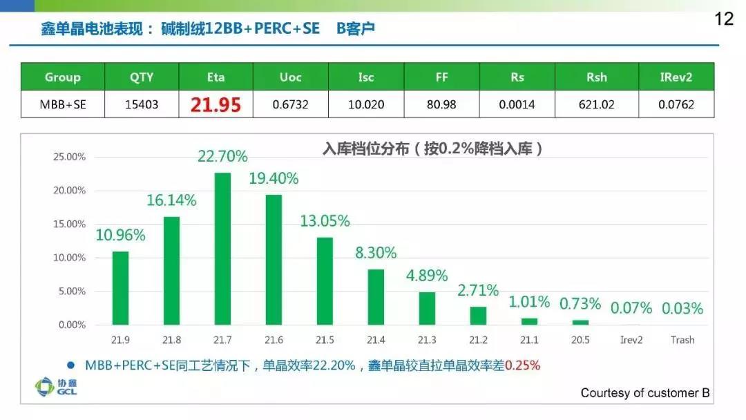 我們可以看到下面三個客戶批量使用“鑫單晶G3”產品的結果。客戶A效率圖中有兩組數據,一組是使用晶花選片之前的,平均效率達到21.7%,低效拖尾基本沒有;另一組是硅片分選后,小晶粒比例偏高的硅片被分選出去,平均效率達到21.8%,低效拖尾沒有。客戶B使用了SE電池工藝,效率達到21.95%,與同一條產線上用CZ單晶的效率相比僅低0.25%;客戶C則用黑硅制絨技術來做“鑫單晶G3”,效率達到21.7%,封裝成組件后與使用單晶堿制絨工藝的功率輸出一樣。