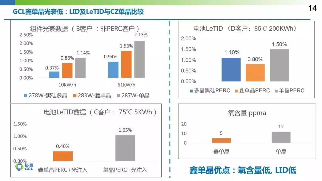 “鑫單晶G3”的另外一個特點是氧含量低,僅為直拉單晶的一半,電池的光衰低。我們看一下LeTID數據,可以發現鑫單晶表現很好。