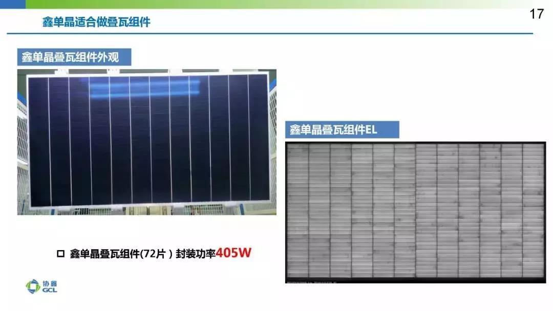 鑫單晶硅片是自然的直方片,更適合于生產疊瓦組件,協鑫集成正在探索走這條技術道路。我認為,這是一個很明智的選擇。這張圖里我們可以看到組件外觀非常整齊,并且72片組件的封裝功率可達405瓦。