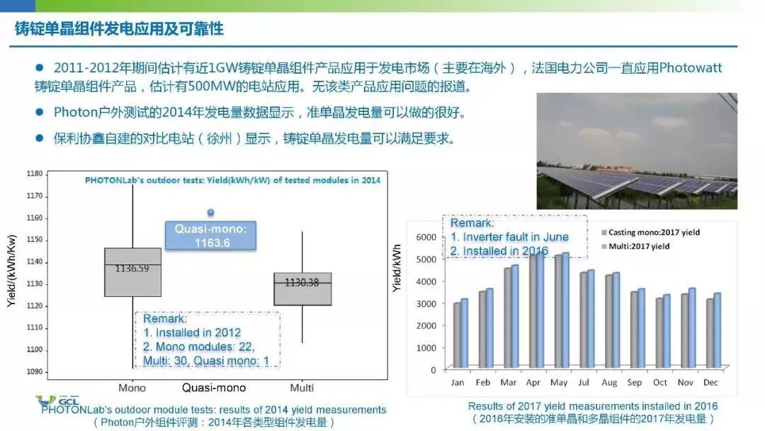 在組件發電應用及可靠性方面,從2011年至今,大概已有1GW鑄錠單晶的產品在市場上應用,其中大都分布于海外。相關數據資料并不豐富,但我們一直在積極尋找采集。目前,法國電力一直應用鑄錠單晶組件產品,近幾年已有幾百兆瓦的規模化應用。