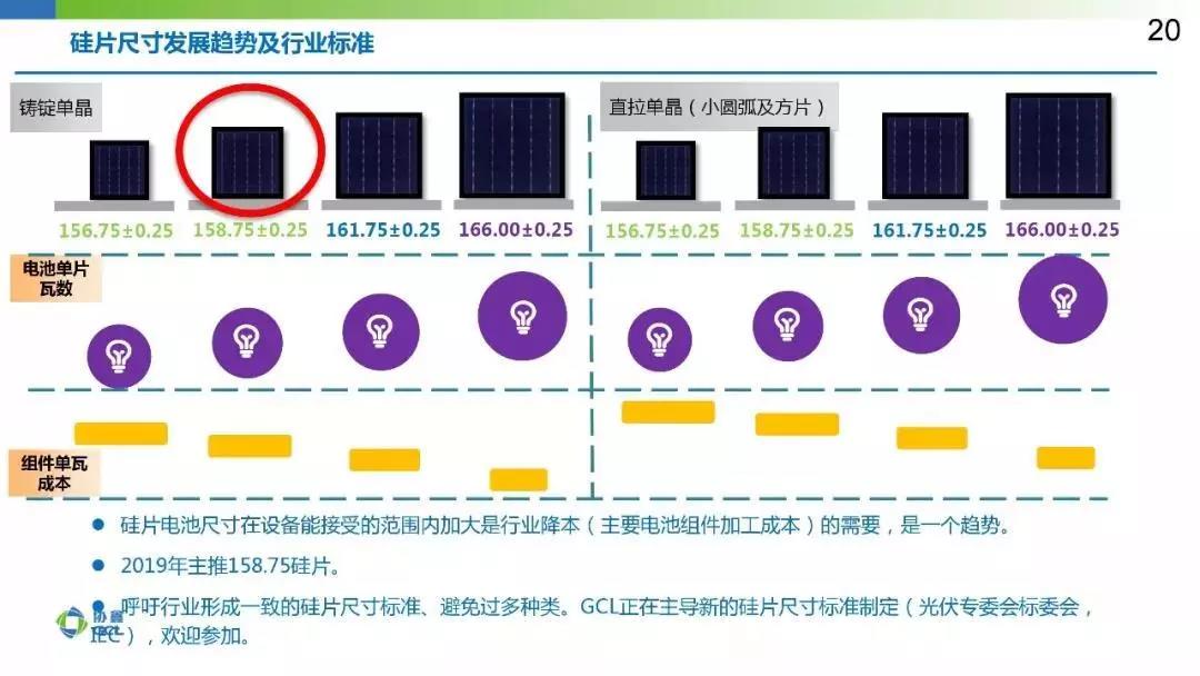 關于硅片尺寸,我的看法是硅片尺寸做大是降低電池和組件制造成本的一個行業大趨勢。硅片尺寸有必要重新標準化,目的有兩個,一是減少目前不同電池組件廠在156.75到158.75毫米之間的許多不同的尺寸。二是未來硅片尺寸定下幾個大家共同接受的尺寸,利于整個產業鏈對未來尺寸有準確的預期,不至于出現太多細小差別的尺寸。我們正通過光伏專委會的標委會平臺牽頭制定硅片尺寸標準,之后再將其發展為IEC標準。我們吁請行業企業盡快參與到硅片標準制定的過程中來。根據市場分析,2019年,硅片將轉為以158.75MM的規格為主。