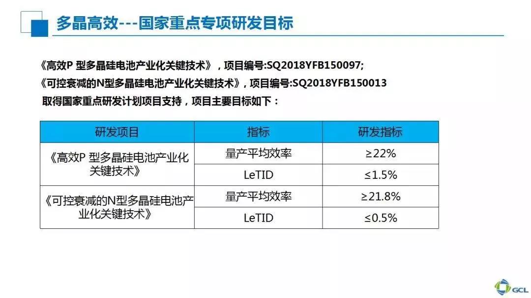下面展示的是我們目前入選國(guó)家重點(diǎn)研發(fā)計(jì)劃項(xiàng)目的科研專項(xiàng),分別是由協(xié)鑫集成牽頭的高效P型多晶產(chǎn)業(yè)化關(guān)鍵技術(shù),以及其他一家知名企業(yè)牽頭的N型多晶項(xiàng)目。目前兩個(gè)項(xiàng)目都已完成公示,即將正式宣布,同時(shí)阿特斯也是我們?cè)谶@兩個(gè)項(xiàng)目上重要的合作伙伴。按照研發(fā)目標(biāo),三年之后,高效多晶電池的平均量產(chǎn)效率將達(dá)到22%以上。
