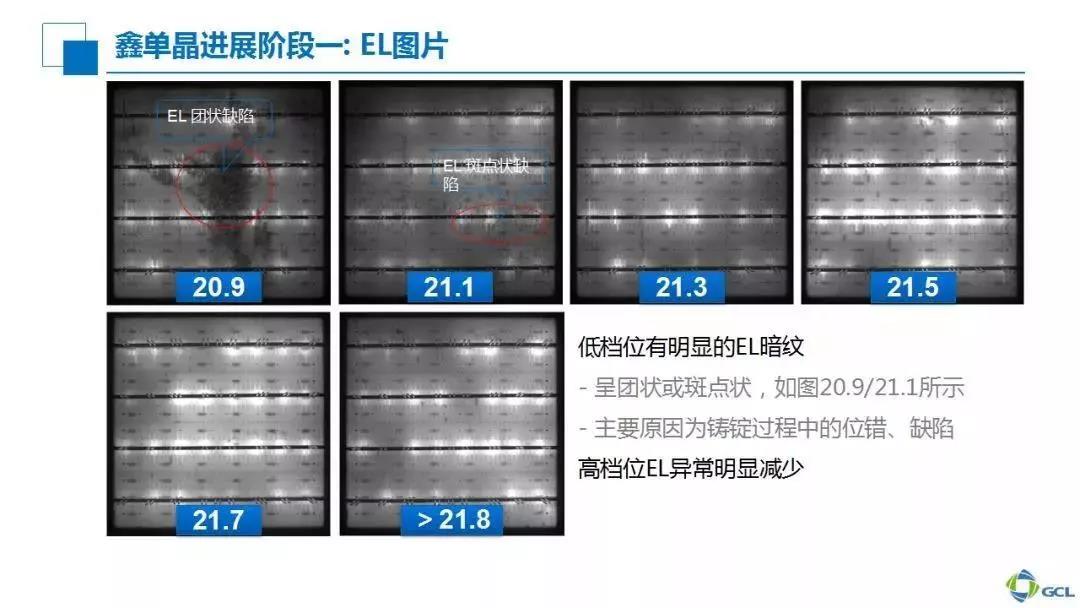下面我們將從電池、組件以及光衰進(jìn)展等三個(gè)層面重點(diǎn)介紹鑫單晶在協(xié)鑫集成的發(fā)展情況。我們可以看到,在第一階段批量投產(chǎn)了大概170萬片電池,并采用5BB工藝后,平均效率在21.2%—21.3%左右,同時(shí)組件檔位功率可達(dá)305瓦左右。在這樣一個(gè)鑫單晶的概念上,我們又疊加了多主柵工藝,可以將平均效率提高至22%。