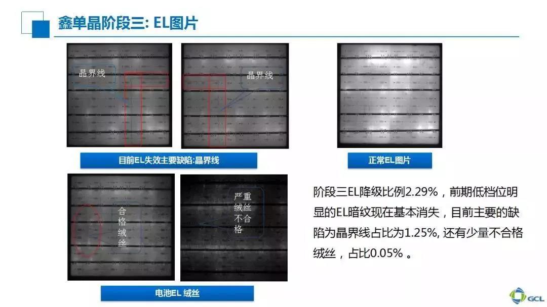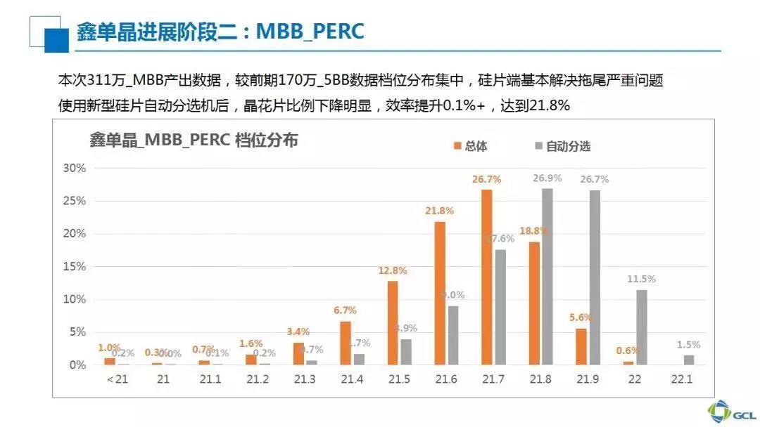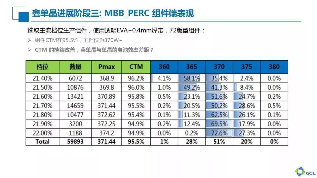 在硅片質(zhì)量有保證以及電池工藝穩(wěn)定生產(chǎn)的情況下,可以看到組件主檔位功率在370W以上的占比達(dá)70%以上。下一步我們主要繼續(xù)提升電池效率和組件CTM,這是我們后期持續(xù)改進(jìn)的一個(gè)方向,也同樣說明鑫單晶有很大的潛力,最終與直拉單晶逼平甚至超越。