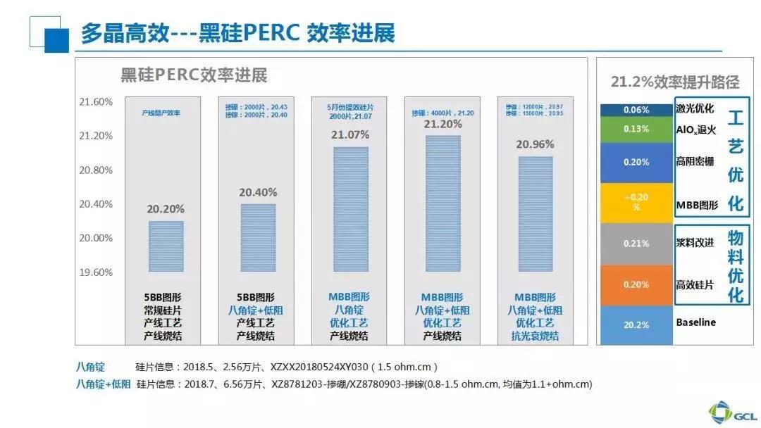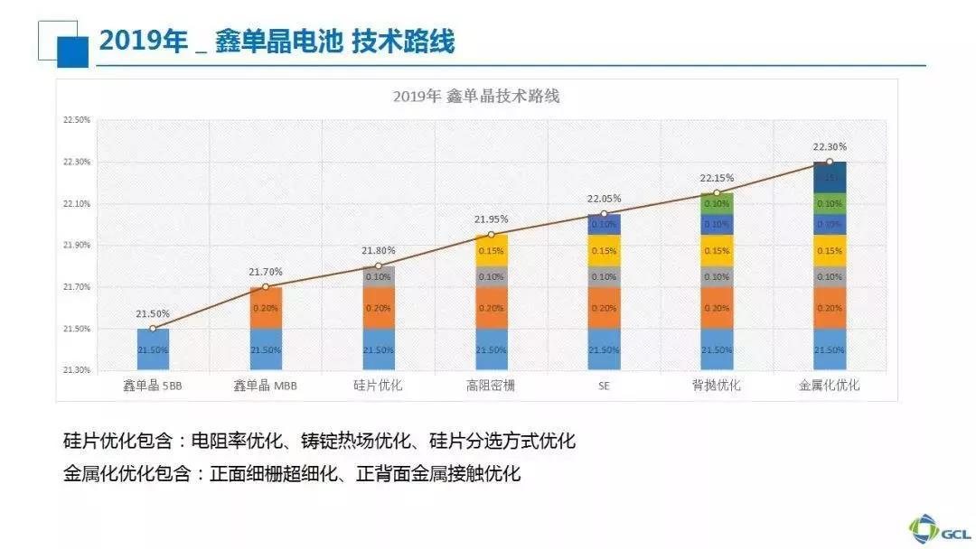 l 2019 多晶PERC量產(chǎn)平均效率21.5%,鑫單晶PERC量產(chǎn)平均效率 22.3%。