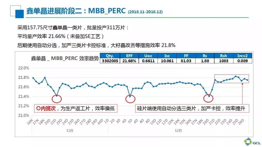 同時(shí)通過第一、第二階段百萬片的生產(chǎn),在產(chǎn)線工藝控制上,平均良率在第一、第二階段已經(jīng)達(dá)到95%的平均水平。此外最關(guān)鍵的是,在鑫單晶生產(chǎn)過程中,晶花比例在逐漸下降。在鑫單晶硅片質(zhì)量得到保證的前提下,進(jìn)行工藝改善,能達(dá)到事半功倍的效果。大家可以看到,在鑫單晶還沒有引入單晶PERC普遍使用SE工藝的情況下,僅從多主柵結(jié)合高阻密柵工藝的9千片試驗(yàn)結(jié)果來看,平均效率就達(dá)到21.95%。