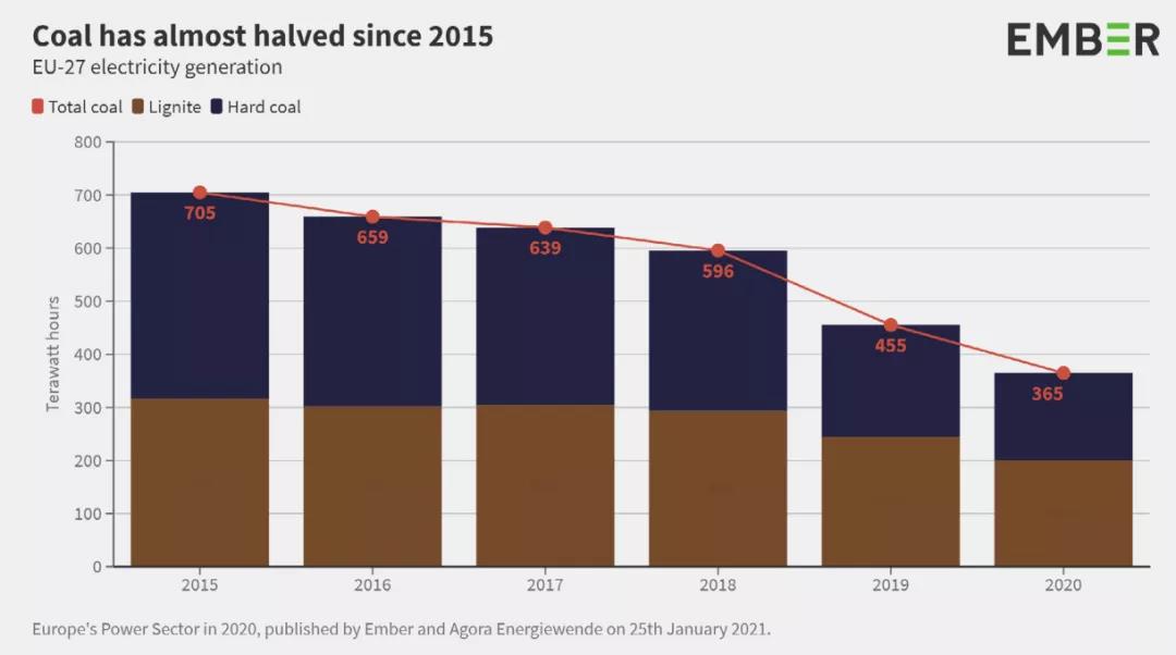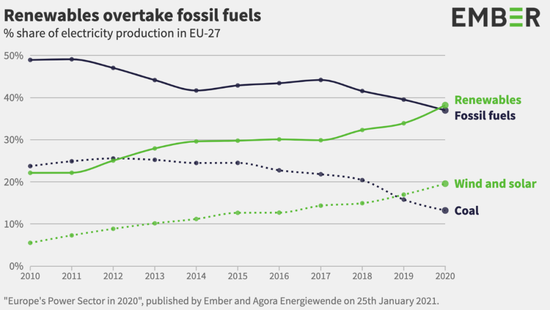 2020年,全球煤炭發電量出現了創紀錄的下跌,幅度達到20%,自2015年以來減少了一半。新增的太陽能和風能為此做出了貢獻,過去一年,太陽能發電量增長15%,風力發電量增長9%,它們共同創造了歐洲五分之一的電力。