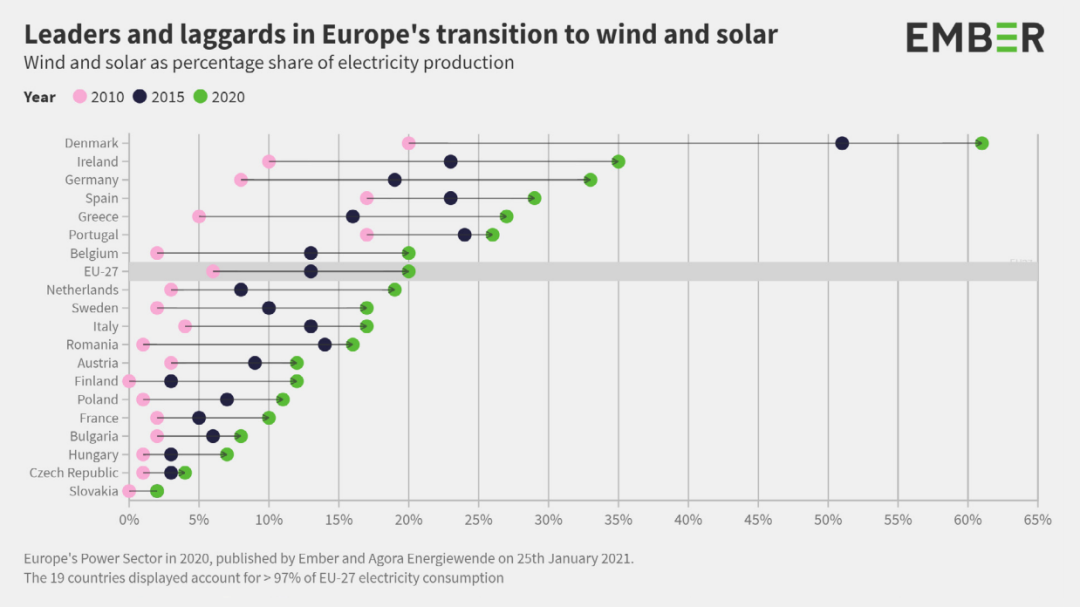 處于領軍地位的是德國和英國,太陽能和風能分別占其發電量的33%和28%。