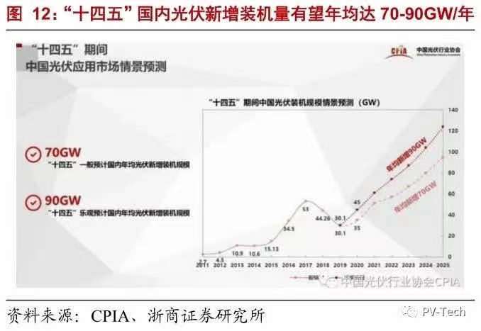 1) CPIA對(duì)光伏行業(yè)“十四五”期間進(jìn)行展望,預(yù)計(jì)在2019-2025年期間,可再生能源將滿足99%的全球電力增量。到2025年,可再生能源在新增發(fā)電裝機(jī)中占比將達(dá)到95%,其中光伏將在所以可再生能源的新增裝機(jī)量占比中達(dá)到60%。