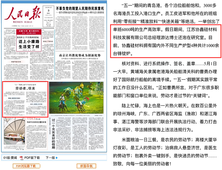 編者按:5月3日,《人民日報》在頭版刊發題為《“五一”假期,離不開他們的堅守——勞動者,很美?》的專題報道,?關注全國科研工作者加班加點奪取紅五月開門紅的杰出團隊和典型人物,?江蘇協鑫硅材料科技發展有限公司?總經理游達博士帶領團隊“五一”期間仍奮戰在實驗室的場景成為焦點之一?。?