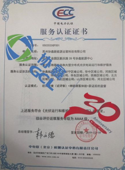 近日,中國電力企業聯合會(下稱:中電聯)正式向協鑫新能源控股有限公司旗下蘇州協鑫新能源運營科技有限公司(下簡稱"運營科技公司")頒發《四標管理體系認證證書》及《運維服務認證證書》,標志著協鑫新能源光伏電站智能運維管理水平得到國家級認證,發展實現雙護航。