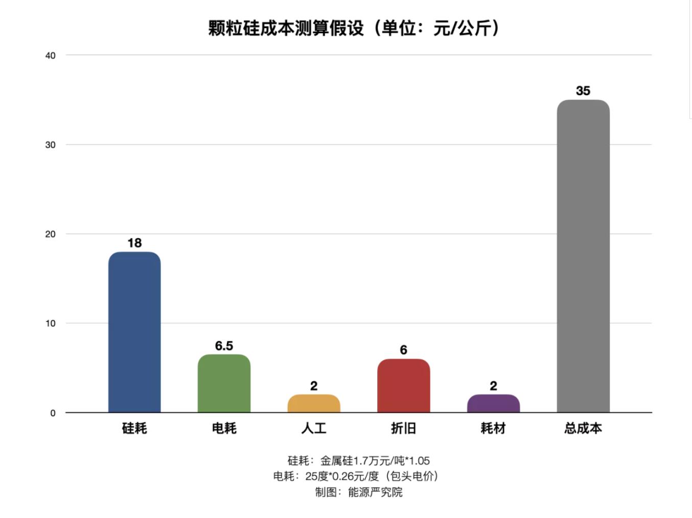 一項關(guān)于顆粒硅成本預(yù)想測算表明,在統(tǒng)計硅耗、電耗、人工、折舊、耗材等成本要素后,顆粒硅的全成本約為每公斤不足35元,甚至更低。