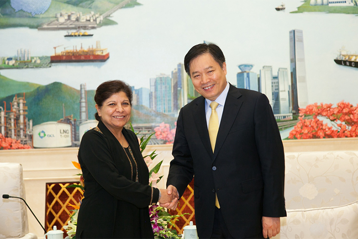 研討會正式開始前,協鑫集團董事長朱共山在協鑫能源中心接待了沙姆沙德•阿赫塔爾一行。在向阿赫塔爾博士介紹協鑫從傳統能源向清潔能源和新能源轉型的業務發展過程中,朱共山提到公司新推出的電動e交通業務,以智能多功能充電樁+新能源汽車一體化發展的新模式,為交通擁堵、霧霾嚴重的大城市提供電動汽車分時租賃服務。朱共山表示,未來的城市家庭不需要自己購買電動車,使用手機終端從就近的充電樁掃碼后就可以把車開走,到目的地附近的充電樁充電、歸還即可。