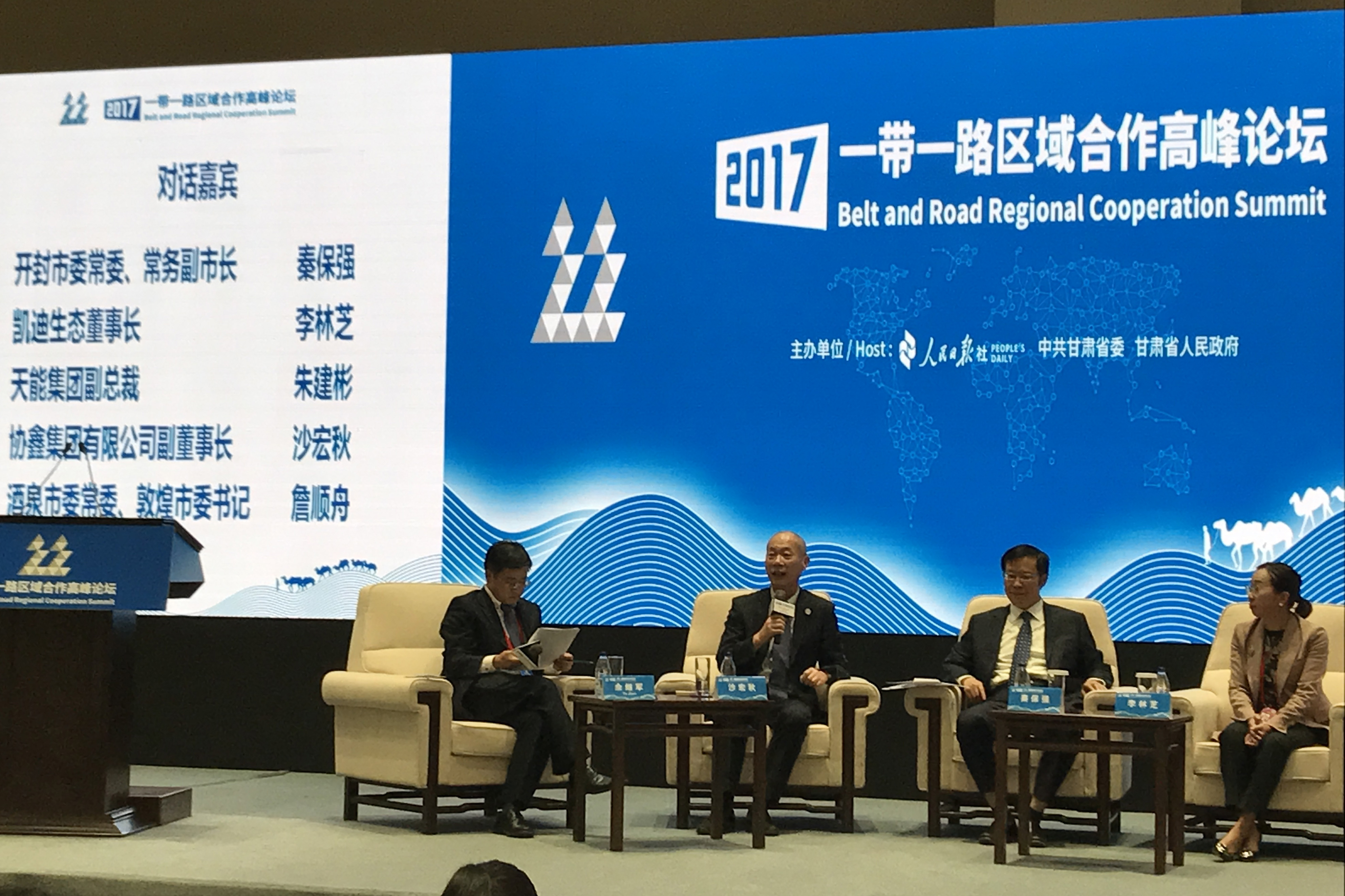 當日下午,作為本屆論壇的重頭戲--2017“一帶一路”區域合作高峰論壇在敦煌國際會議中心舉行,人民日報社副社長張建星發表致辭。在人民日報社文化傳媒有限公司、人民日報數字傳播有限公司 董事長余繼軍主持的高端對話環節,沙宏秋與開封市委常委、常務副市長秦保強,酒泉市委常委、敦煌市委書記詹順舟,凱迪生態董事長李林芝等5位政商嘉賓圍繞中國新能源及清潔能源企業積極響應“一帶一路”倡議,抱團出海、合作共贏,推進區域聯動發展與產業化協作等話題交流對話、建言獻策。沙宏秋表示,人類共同面對的生態環境變化,需要我們堅定不移地踐行綠色發展。在全球能源變革與綠色中國這個宏大的命題前,協鑫集團將一如既往地以開放的心態與情懷,與所有的行業、企業和戰略伙伴抱團發展、共同擔當,為交上一份天更藍、水更清、山更綠、居更佳的綠色答卷,貢獻新能源與清潔能源產業發展的“協鑫力量”。