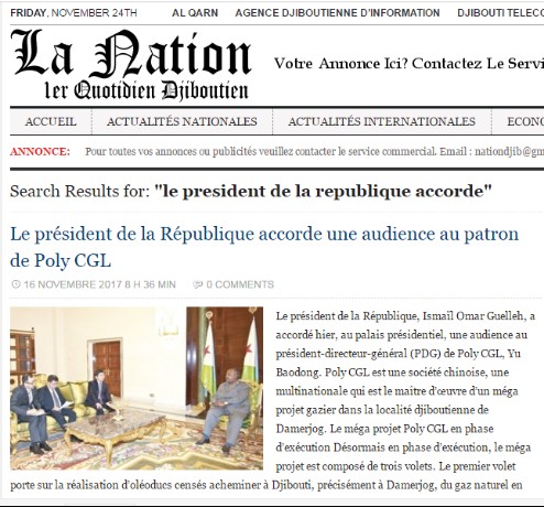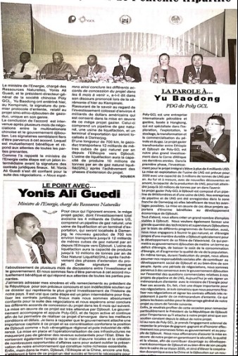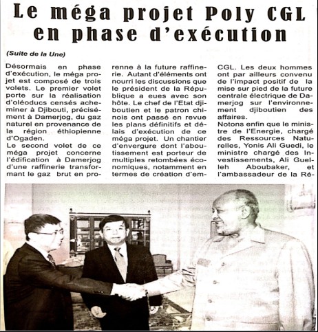 吉布提《民族報》關于保利協鑫石油天然氣董事長于寶東拜訪蓋萊總統的報道。