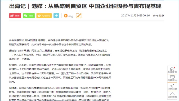《參考消息報》關于中國企業積極參與吉布提基建的報道。
