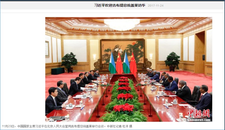應國家主席習近平邀請,吉布提共和國總統伊斯梅爾·奧馬爾·蓋萊于11月22日至25日對中國進行國事訪問。國家主席習近平23日在人民大會堂同來華進行國事訪問的吉布提總統蓋萊舉行會談。新華網、中國日報社、央廣網等多家國內外媒體對此進行了報道。