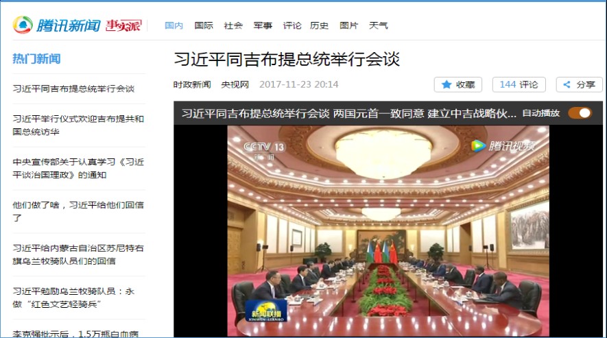 騰訊新聞及央視網關于習近平主席會見吉布提總統蓋萊的相關報道。