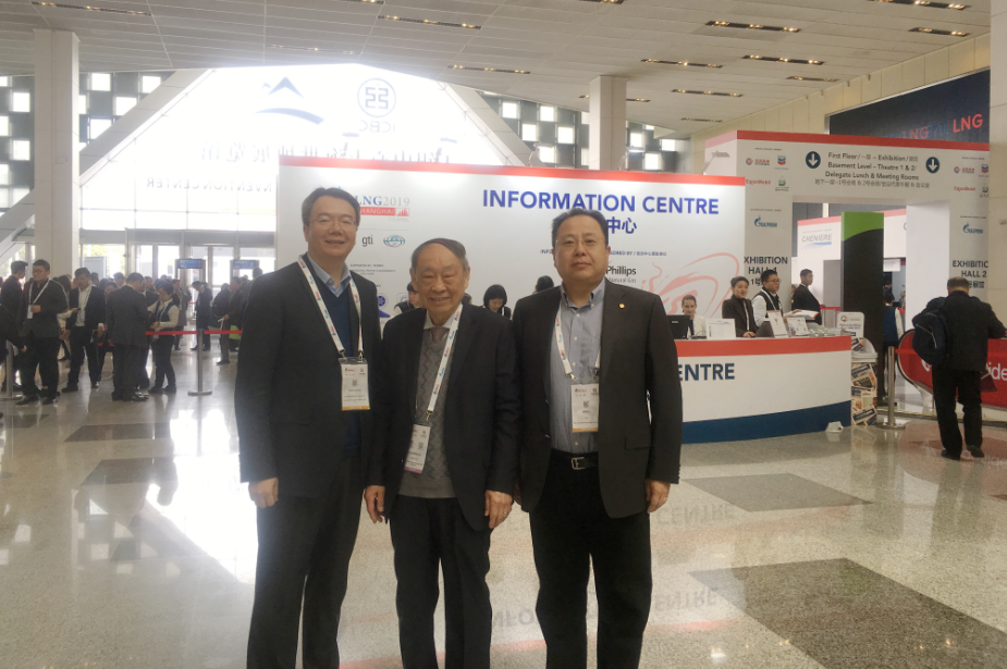 (上海交通大學教授、大會召集人顧安忠(中)在會議間隙,與保利協鑫天然氣集團高級副總裁李韋(右)、LNG高級設計總監陳文煜(左)合影)