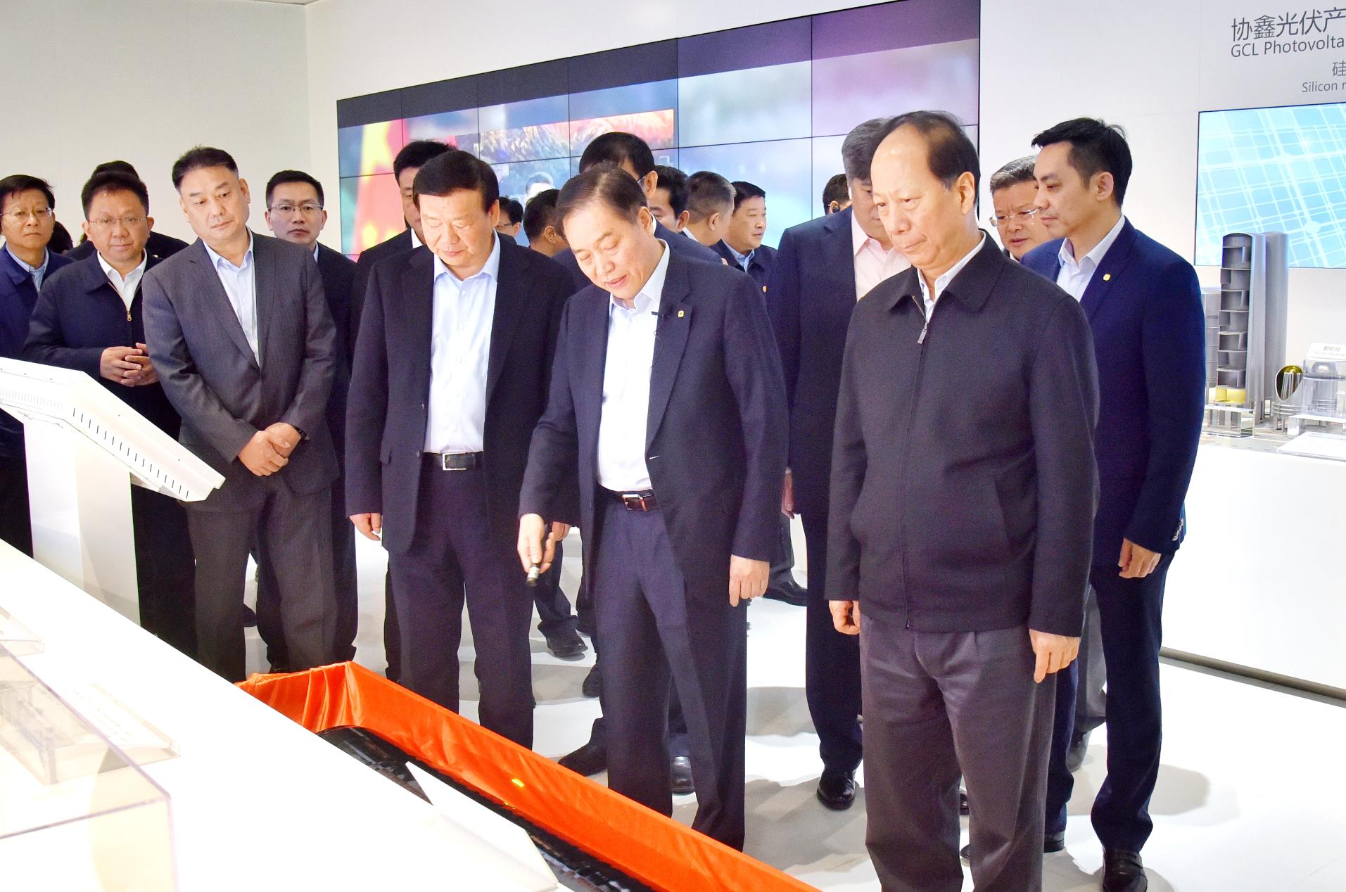 4月20日上午,在江蘇省委書記、省人大常委會主任婁勤儉,江蘇省委常委、蘇州市委書記許昆林,江蘇省委常委、省委秘書長、副省長趙世勇,江蘇省副省長齊家濱等領導的陪同下,內蒙古自治區黨委書記、人大常委會主任石泰峰率內蒙古黨政考察團專程到協鑫集團考察調研。協鑫集團董事長朱共山現場匯報顆粒硅、鈣鈦礦、疊瓦等協鑫七大黑科技,以及協鑫在踐行“碳達峰、碳中和”時代使命中迸發蓬勃力量的重要作用。
